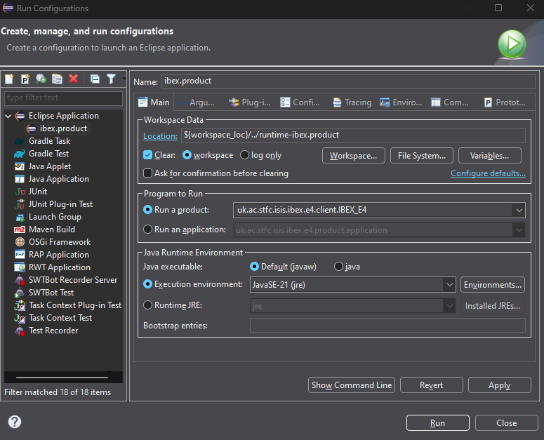 Next, From the menu bar choose Run->Run configurations and select ibex.product from the left hand list under