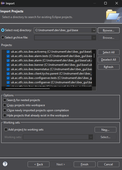 Choose “Select root directory” and browse to c:\Instrument\dev\ibex_gui\base. You should now see a list of plugins